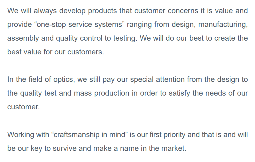 Optiikan saralla kiinnitämme edelleen erityistä huomiota suunnittelusta laatutestaukseen ja massatuotantoon, jotta voimme täyttää asiakkaamme tarpeet.
