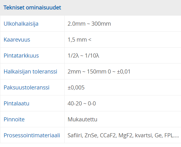 Sylinterimäinen linssi: Sylinterimäinen linssi tarkentaa tai suurentaa valoa vain valonlähteen yhden ulottuvuuden yhden akselin sisällä. Näitä sylinterimäisiä linssejä käytetään valon tarkentamiseen ohuille linjoille optisen metrologian, laserskannauksen, spektroskopian, laserdiodien, akooptisten ja optisten prosessorisovellusten alalla. Lieriömäisten linssien materiaalina käytetään N-BK7 lasia, UV-sulatettua piidioksidia tai CaF2.