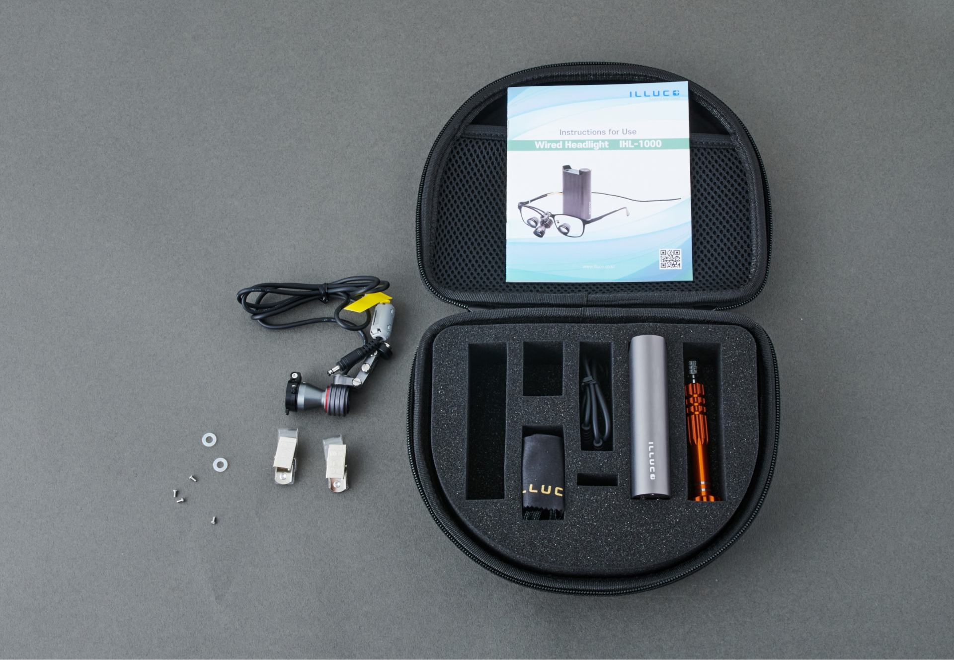 1 kpl ILLUCO IHL-1000 LED-valaisinyksikkö & Keskusyksikkö: Ultra-kevyt (20 g) optiikka yhdistettynä kompaktiin tehoakkuun, joka tuottaa jopa 45 000 luksin kirkkauden.